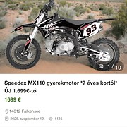 Eladó Speedex MX110 Új állapotú Gyerek Cross motor.Teljesen új,szinte csak kipróbálva volt,amit a gyári beépített üzemóra mérő is igazol.Szinte verseny motor minőség,felső kategóriába tartozik.Nem összekeverendő az olcsó társaival,így ha azzal a minőséggel nem szeretnél bajlódni,ez kiváló választás lesz.Ez úgy működik mint egy műszer,nagy motorokat megszégyenítő fékek és állíható futómű van alatta,itt a lengéscsillapítók valóban dolgoznak.110ccm-es motor hajtja,ami röpsúlyos”automata váltós”.Így igazán könnyű kezelni.Önindítós,így egy gombnyomásra indul.6-7 éves kortól ajánlom.12”-14” kerekek.Az egész motor állapota makulátlan,valóban mint ha új lenne.Alkalmi áron fix 400e ft-ért vihető.